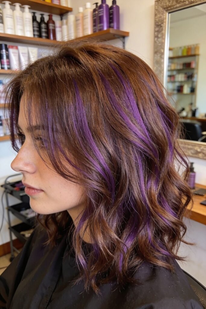 If you want to have fun, purple highlights add a bold but surprisingly wearable twist. Against brown hair, the color looks rich and multidimensional rather than loud. It’s perfect for anyone craving personality in their style.