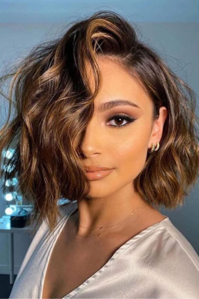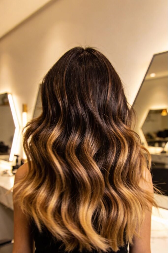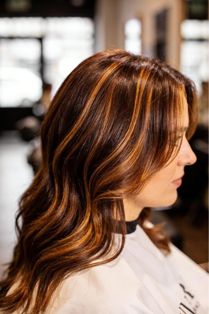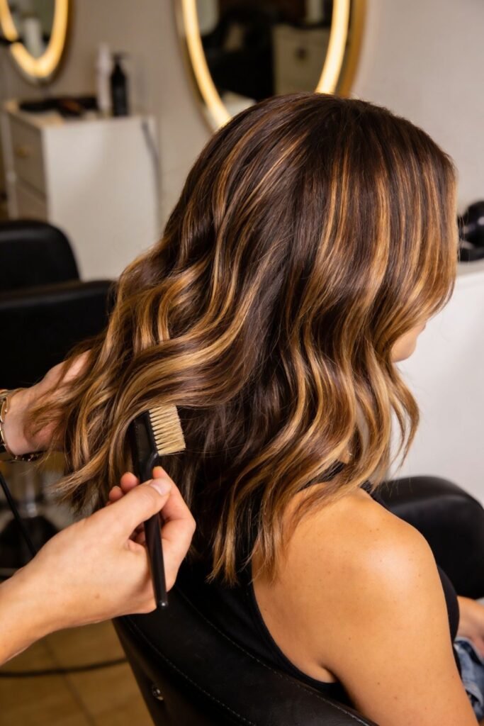 Nothing catches the light like golden highlights, especially when styled in loose waves. They create a sun-kissed finish that makes brown hair look radiant and healthy.