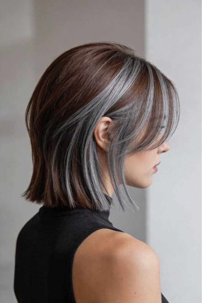 Gray highlights are modern, chic, and incredibly striking when blended into brunette hair.