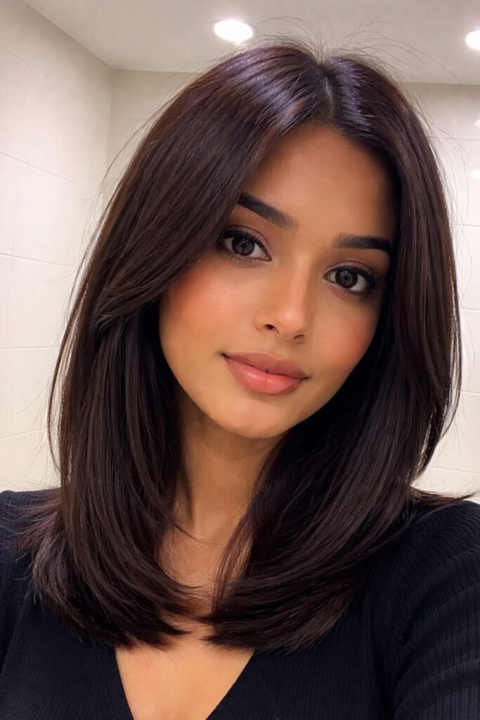 This sleek, dark brown long bob shows how rich, glossy color can instantly sharpen a simple everyday look. The deep chocolate shade frames the face beautifully and makes warm skin tones, gold jewelry, and soft makeup stand out without trying too hard.