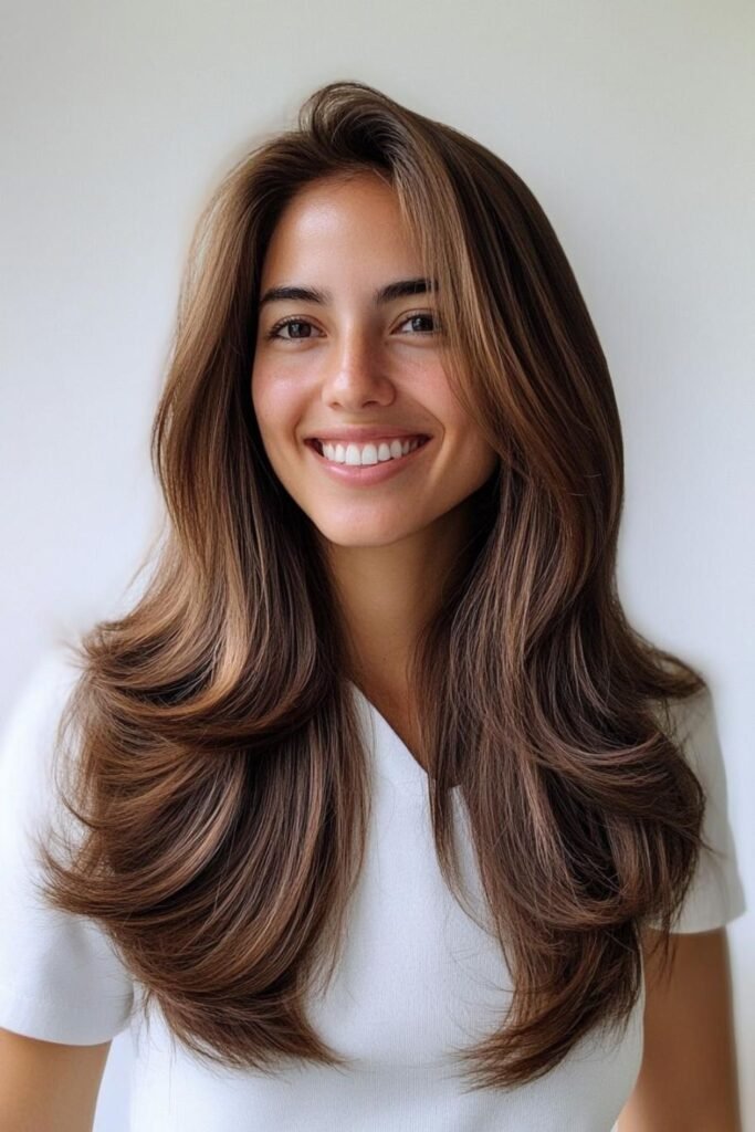 Layered dark brown hair looks so fresh here, with soft shaggy ends that keep the color from feeling heavy.