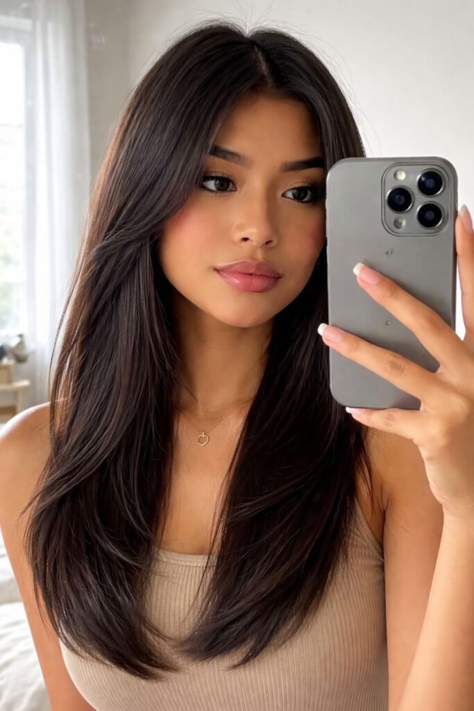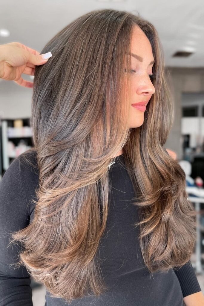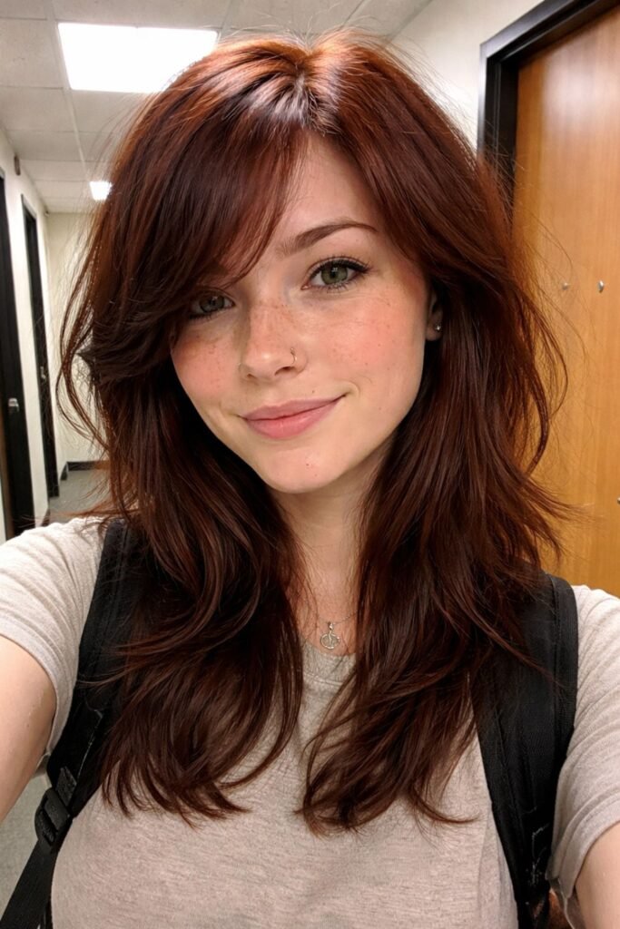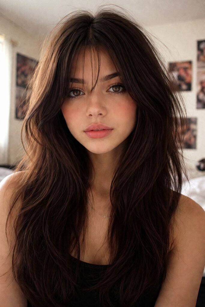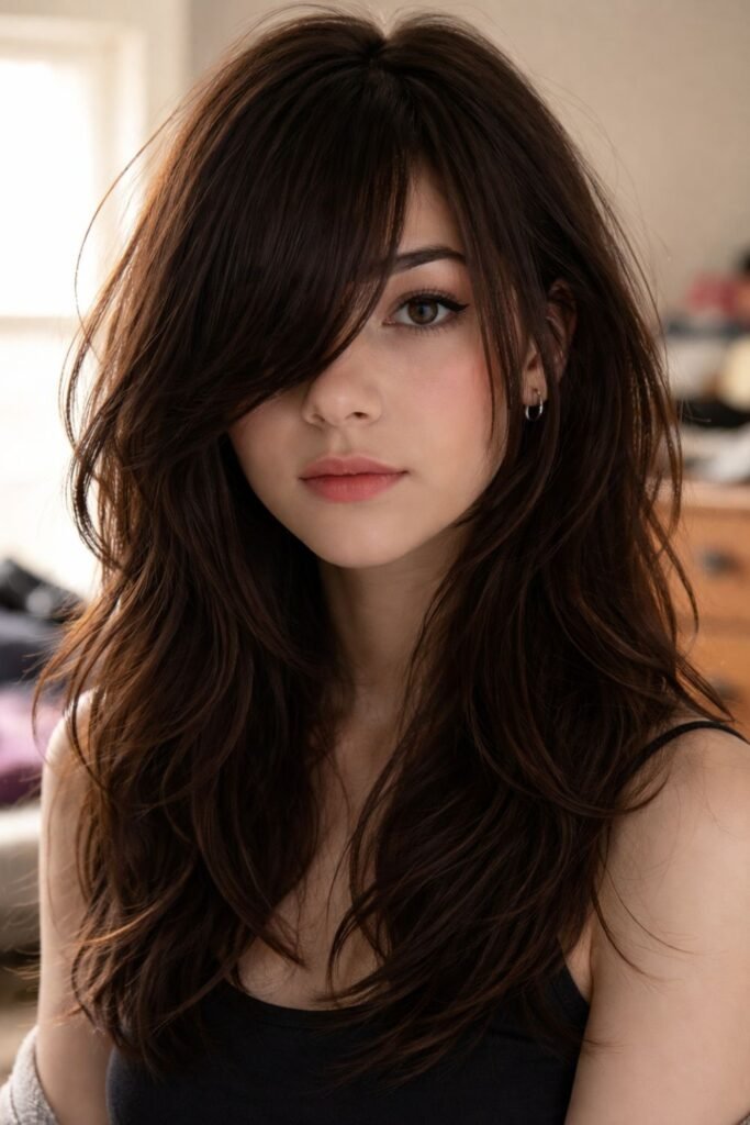 Dark chocolate layers give this long cut a rich, cozy feel, while the side-swept bangs frame the eyes in the softest way. The deep brown shade keeps things low-key and polished.