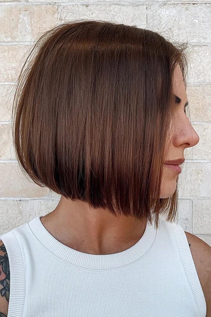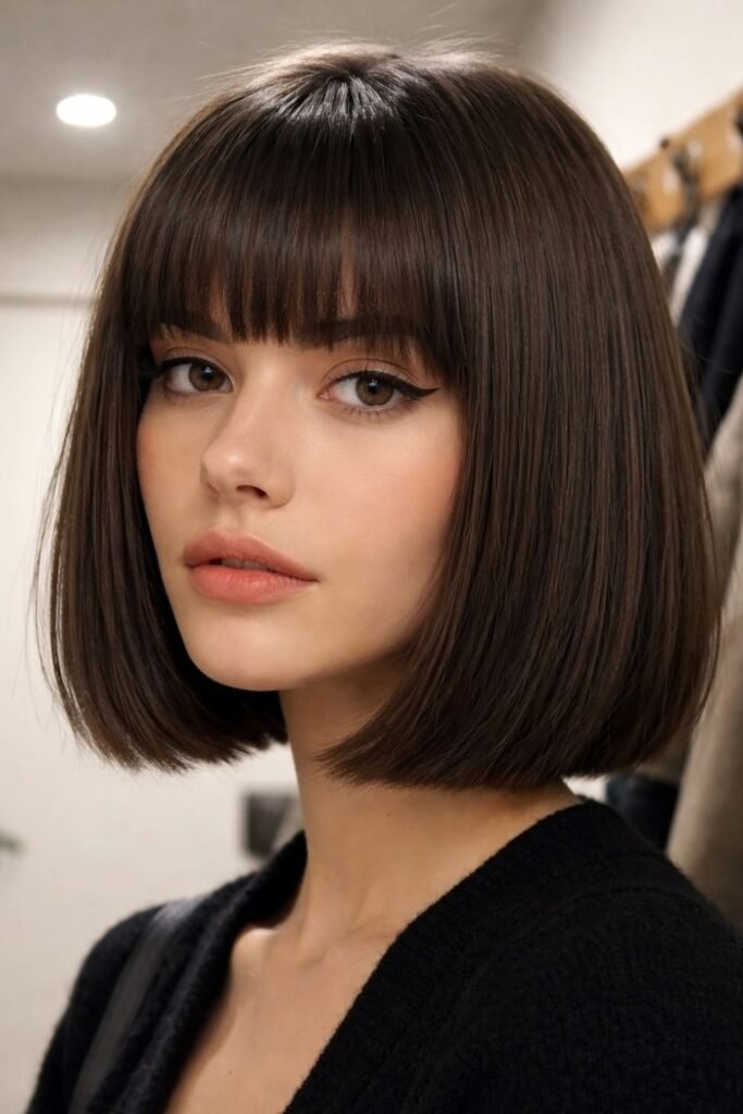 This sleek dark brown bob with a full fringe feels quietly polished and modern. The rich, even tone frames the face beautifully, softening the eyes and giving the skin a warm glow.