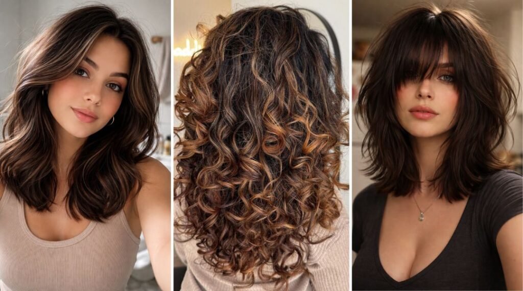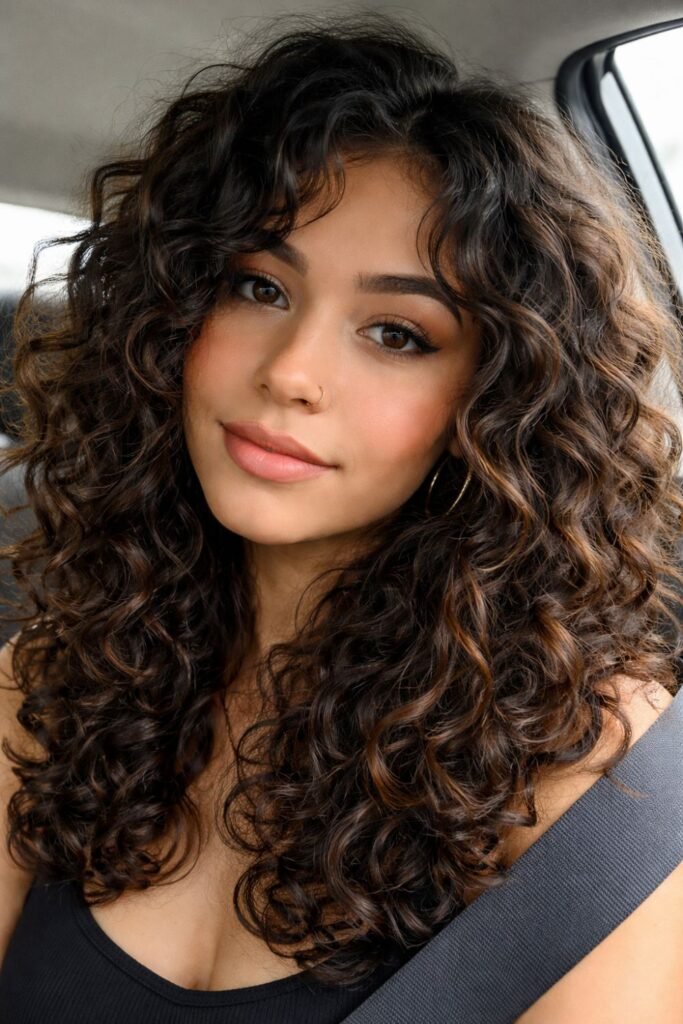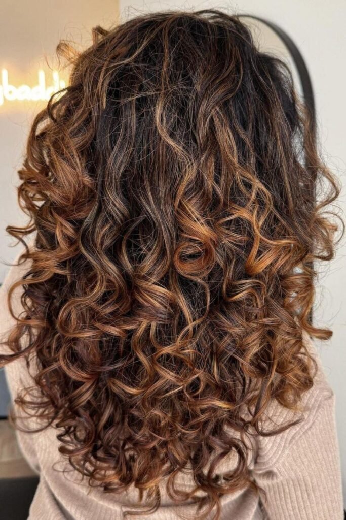 This dark brown curl look leans into rich, chocolatey tones with soft caramel pieces threaded through the curls.