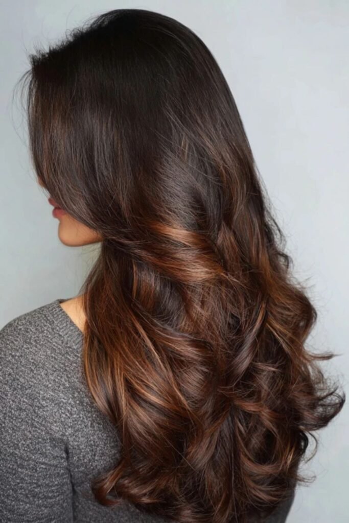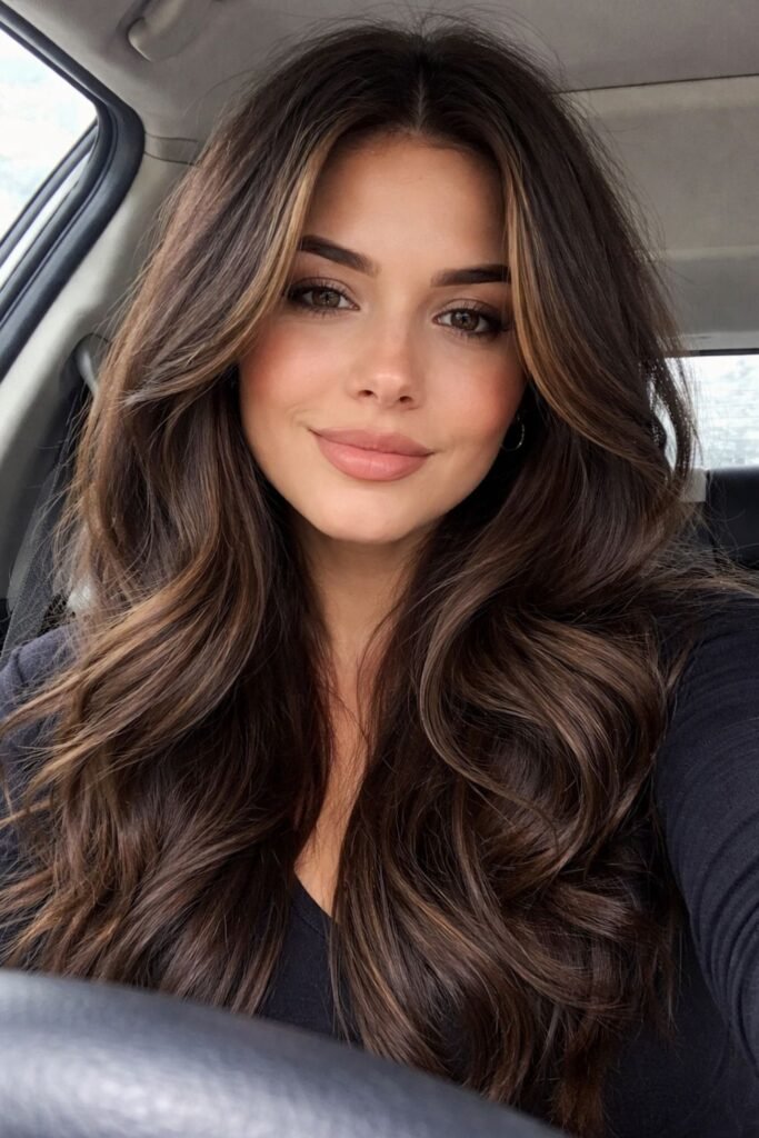Dark brown waves get a cozy upgrade here with soft caramel pieces woven through the mid-lengths and ends. The rich base keeps the color low-maintenance, while the lighter bits brighten the face and give the hair a full, plush look.