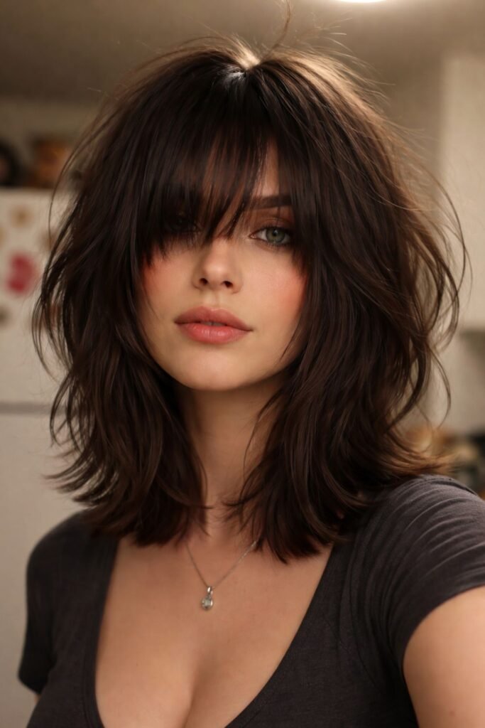 The deep brunette shade keeps everything soft and wearable, adding depth around the eyes and making the skin look warm and fresh, while the curtain bangs blend into the layers for a relaxed, lived-in vibe.