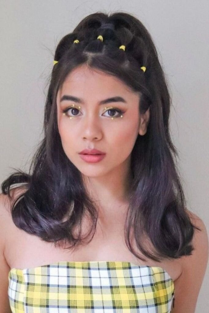 This one is such a fun twist on a classic half-up style. Tie the top section, then create two small bubble braids within that section. It adds texture and detail without needing a ton of effort.