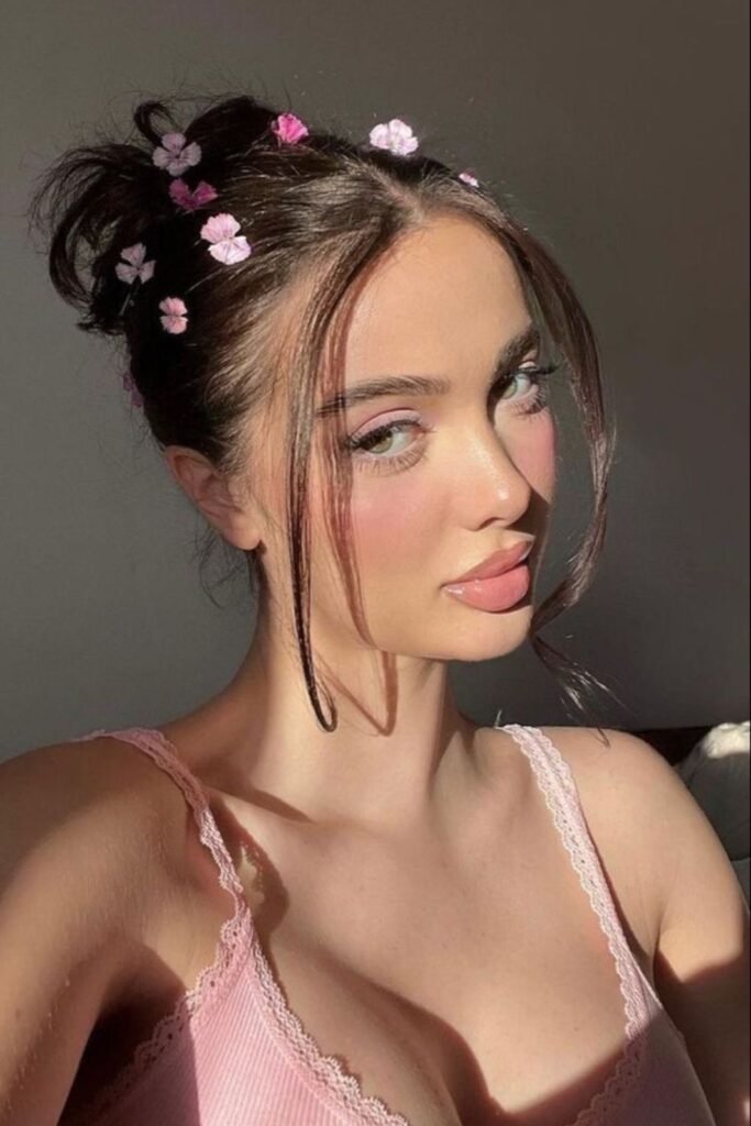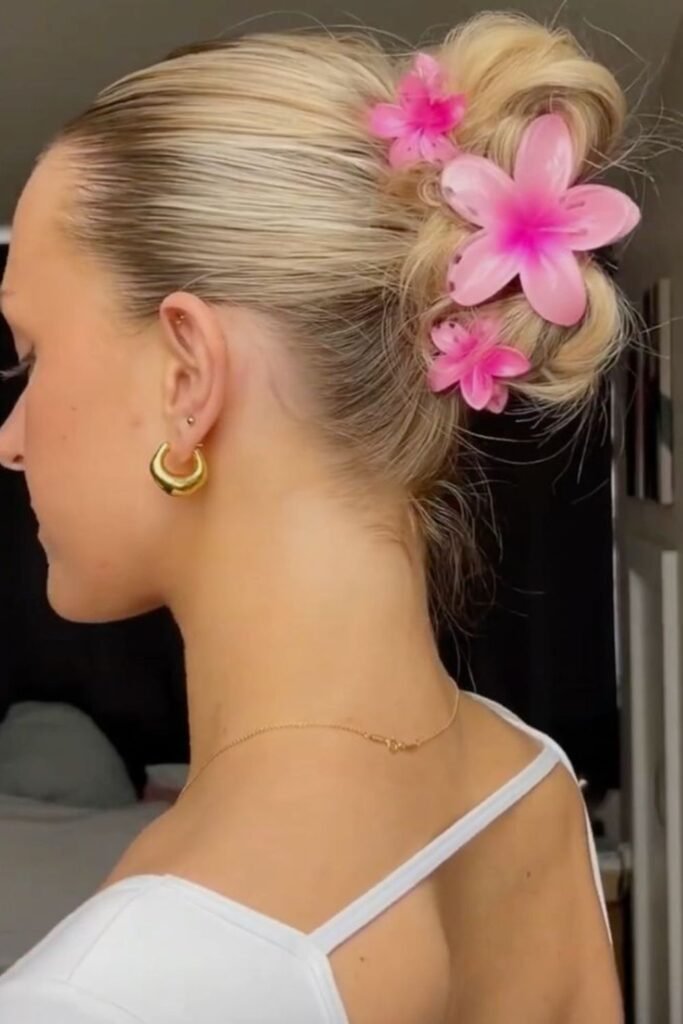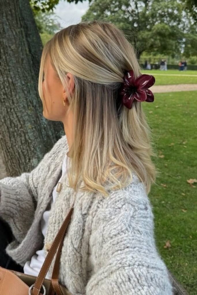Take your usual claw clip hairstyle and elevate it with tiny flowers tucked into your hair. Whether they’re real or faux, they add a soft, dreamy touch that makes your whole look feel more intentional.