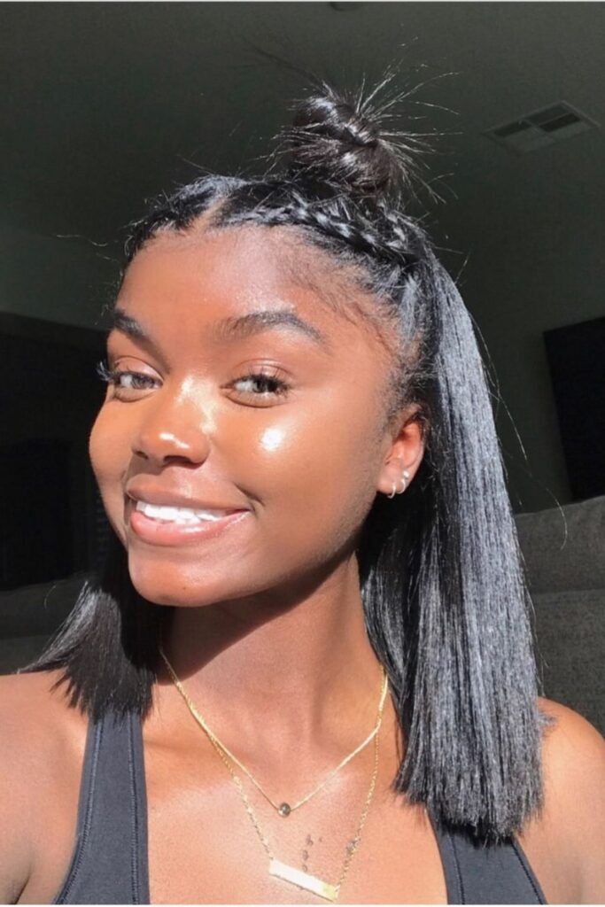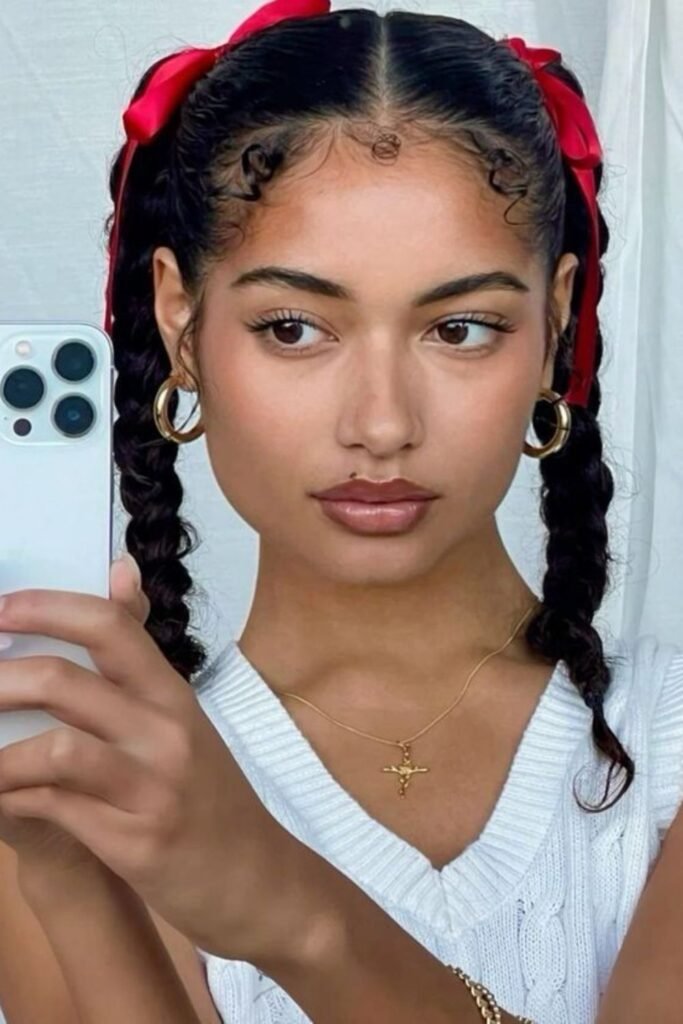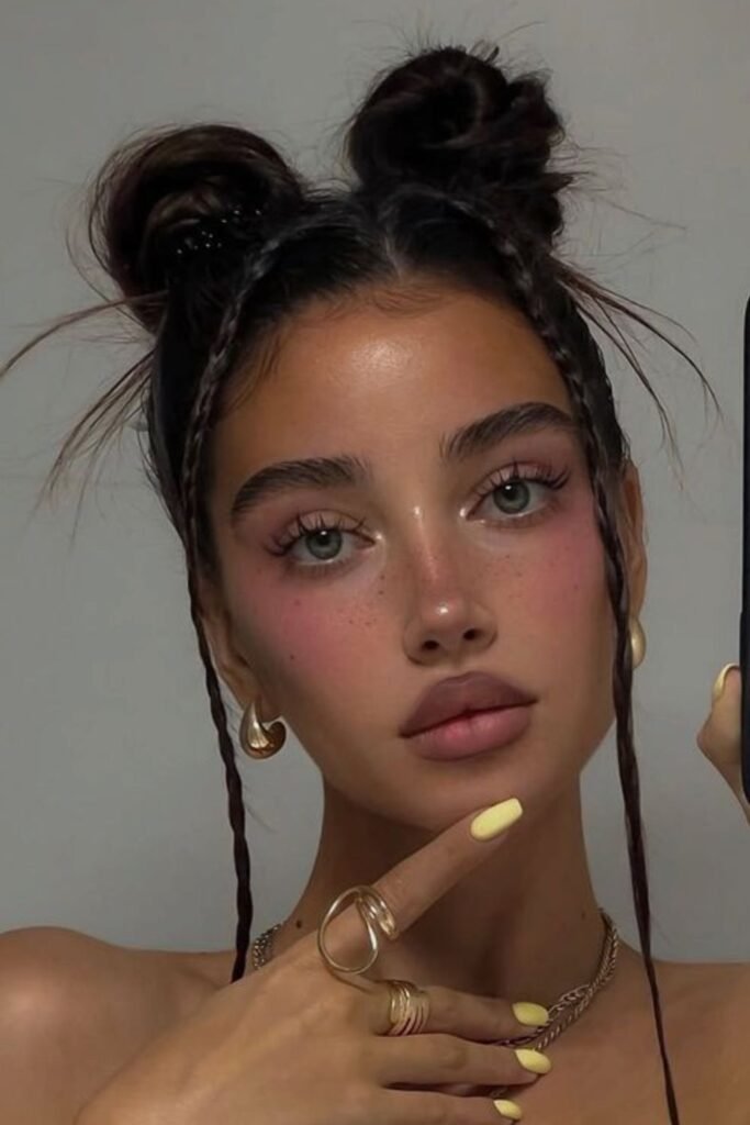 This look is bold in the best way. Create two high buns and leave out small sections in the front to braid. It adds detail without doing too much, and it instantly makes your whole hairstyle feel more styled.