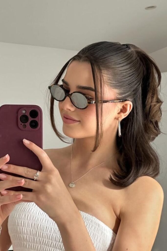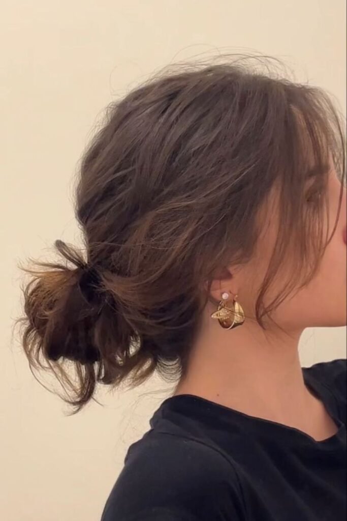 This one is giving soft, pretty, and slightly put-together without being too serious. Pull your hair into a low bun, then curl a few pieces around your face to add that effortless vibe. It’s perfect for days when you want to look polished but still feel comfortable.