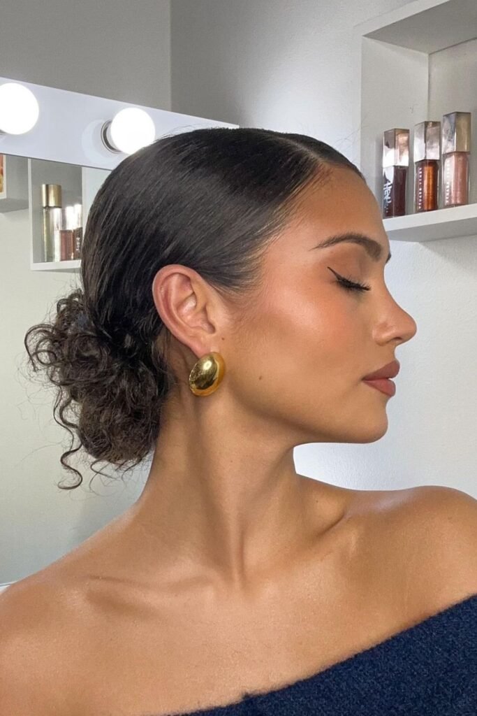 This is for those “I woke up late but still look good” days. Toss your hair into a low bun, pull out a few strands, and let it be perfectly imperfect.