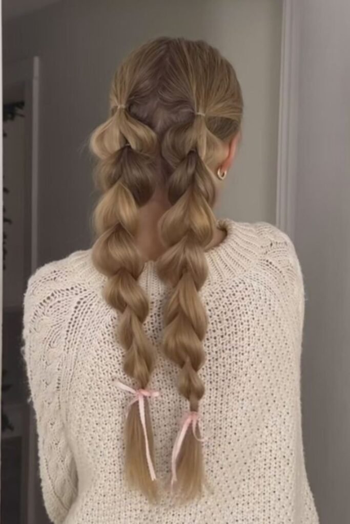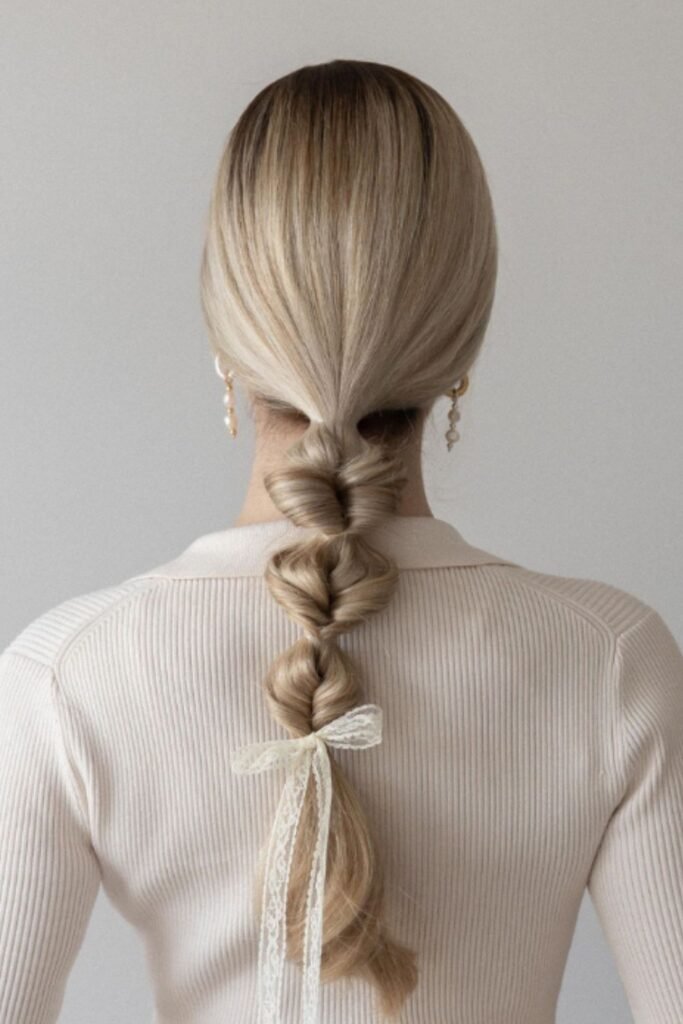Why go for a regular braid when you can make it bubbly? Section a low ponytail with elastics and gently pull each part for that puffy effect—so fun and eye-catching.