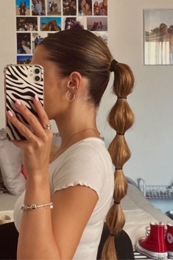 Take your bubble ponytail and level it up with bows. Add little clips to each section for a look that’s playful, bold, and impossible to ignore.