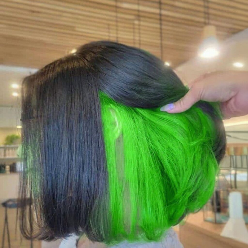 Neon green under color hair is for the bold and fearless. It creates an instant wow moment when it shows through, especially in updos. If you love daring dyed hair ideas, this one’s a must-try.