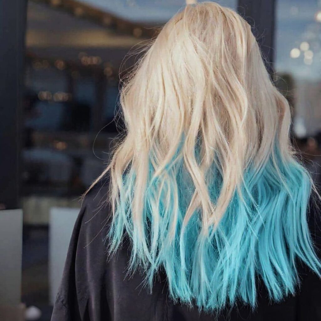 Ice blue under color hair gives major cool-toned, wintery vibes. It looks stunning against darker roots and adds a unique twist to classic peekaboo highlights.