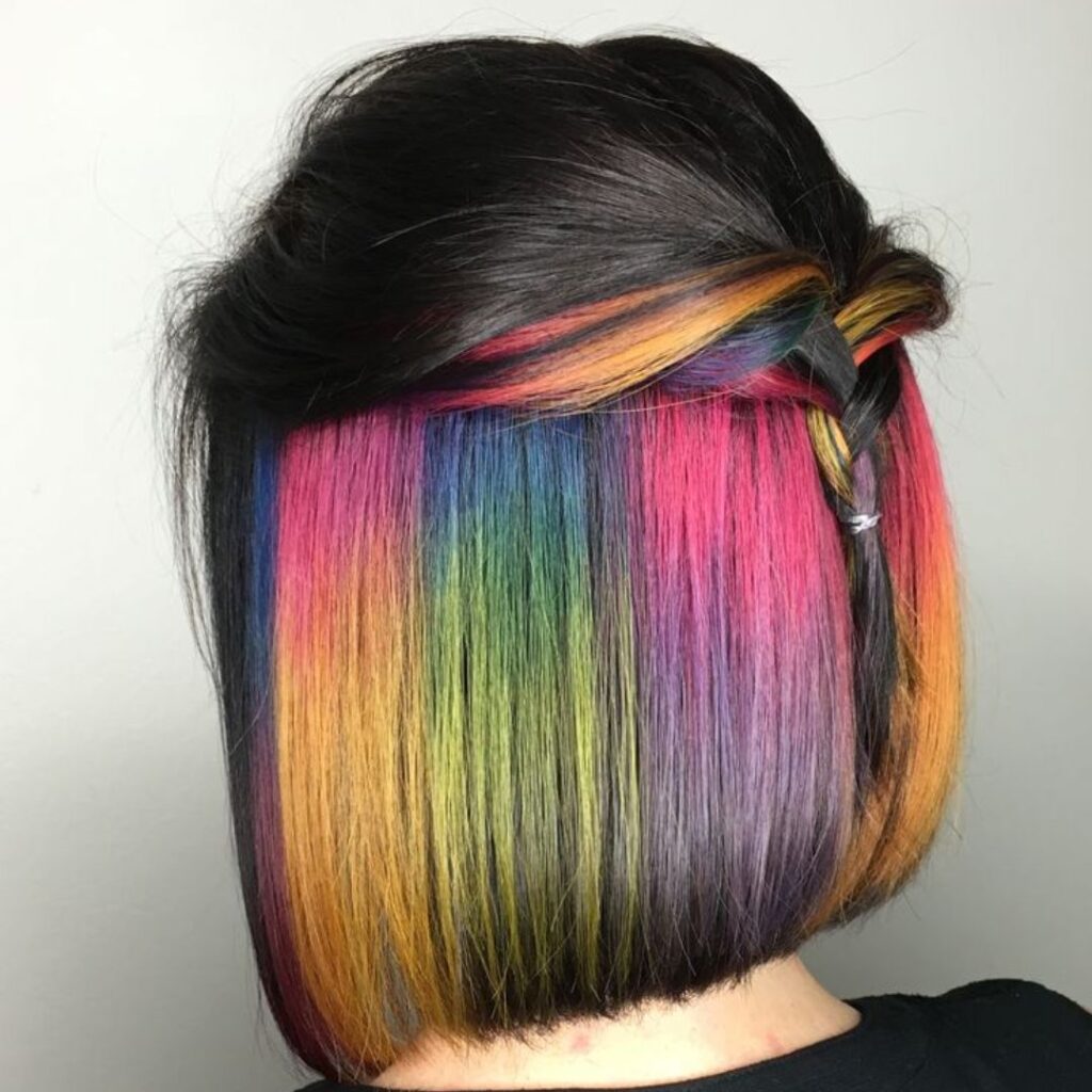 Rainbow peekaboo hair is pure fun and perfect if you can’t choose just one color. The hidden placement keeps it playful without being overwhelming.